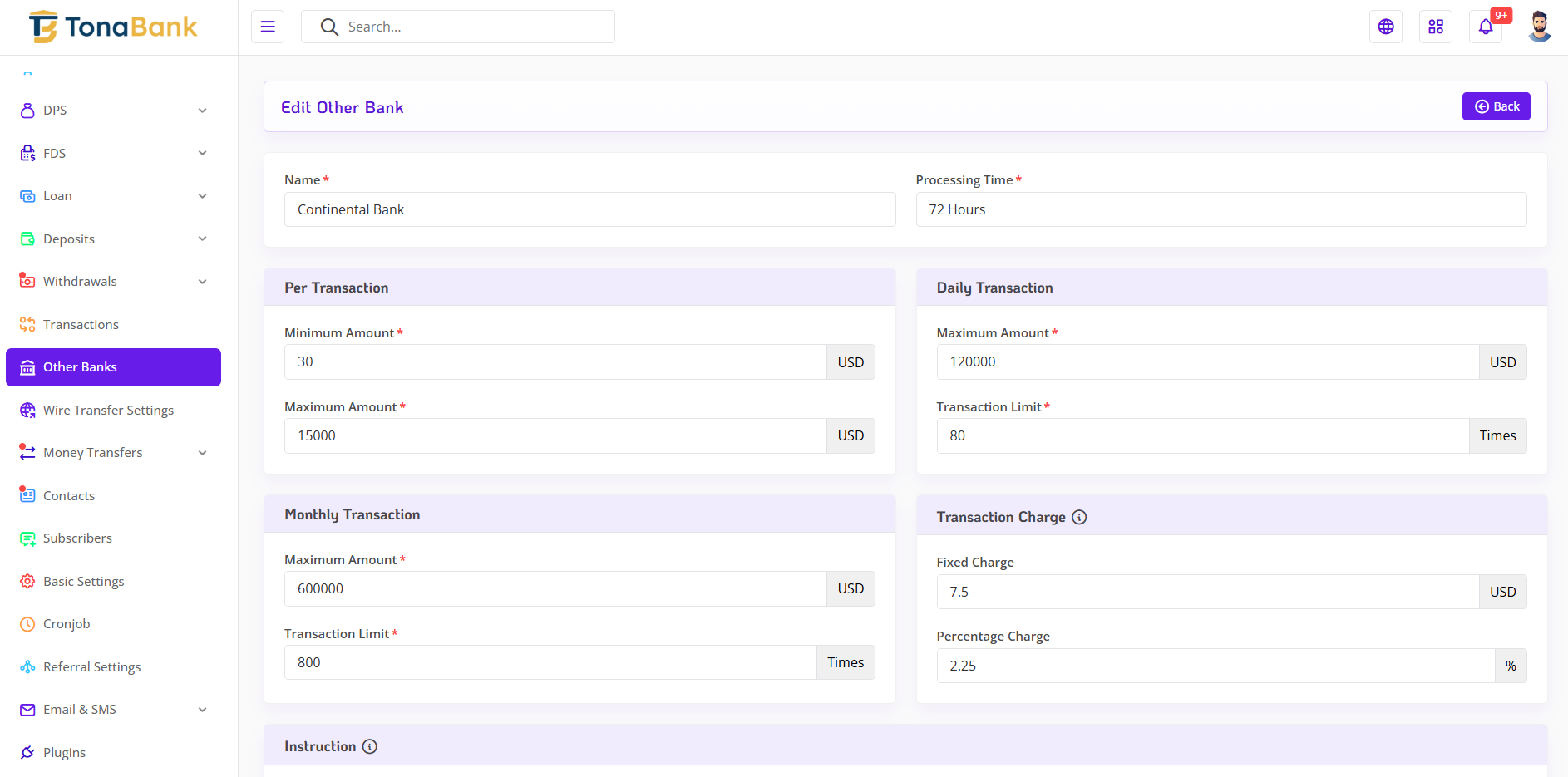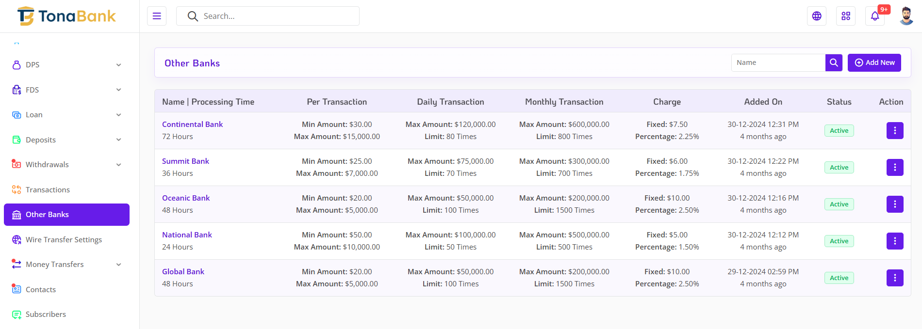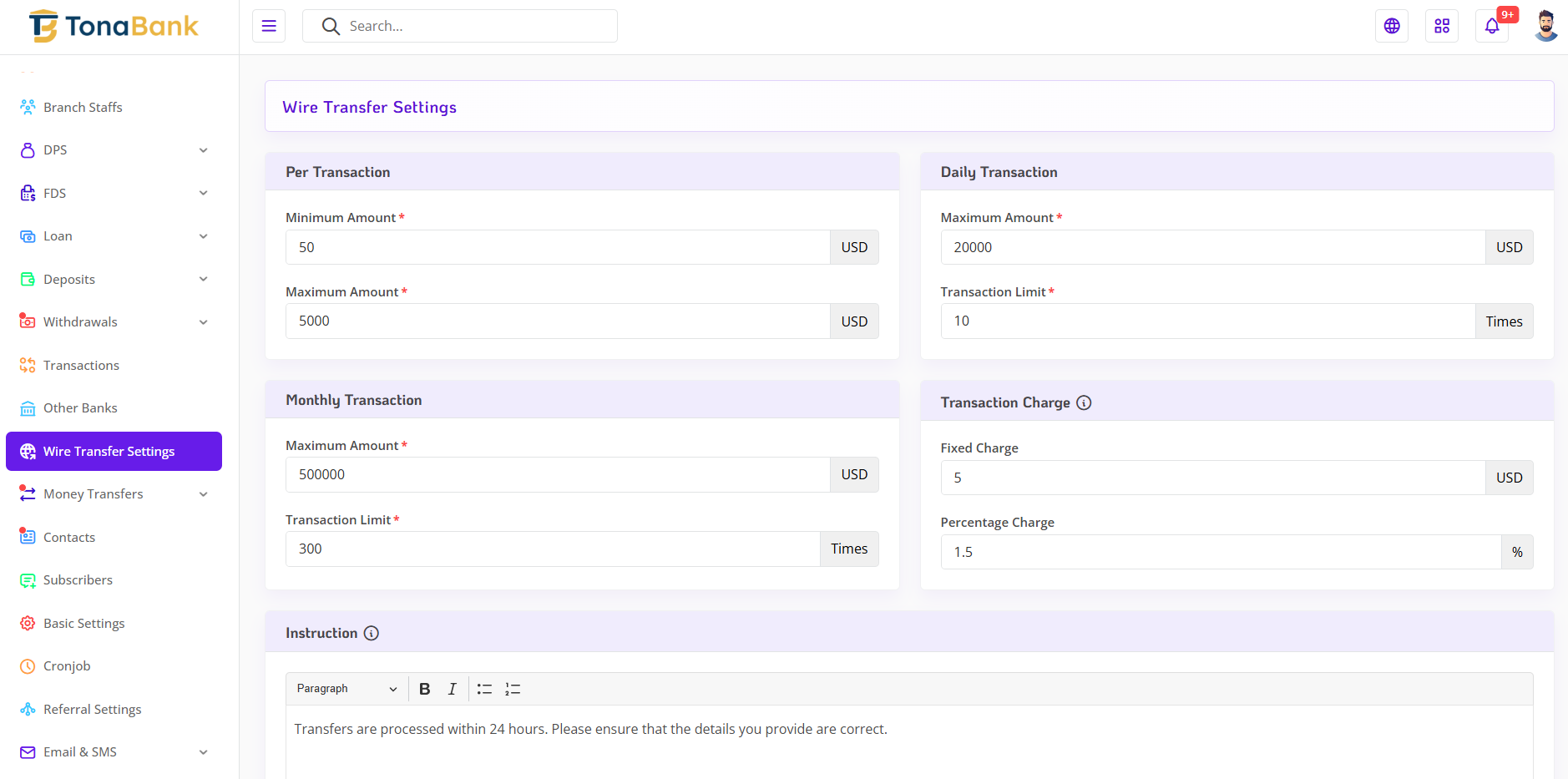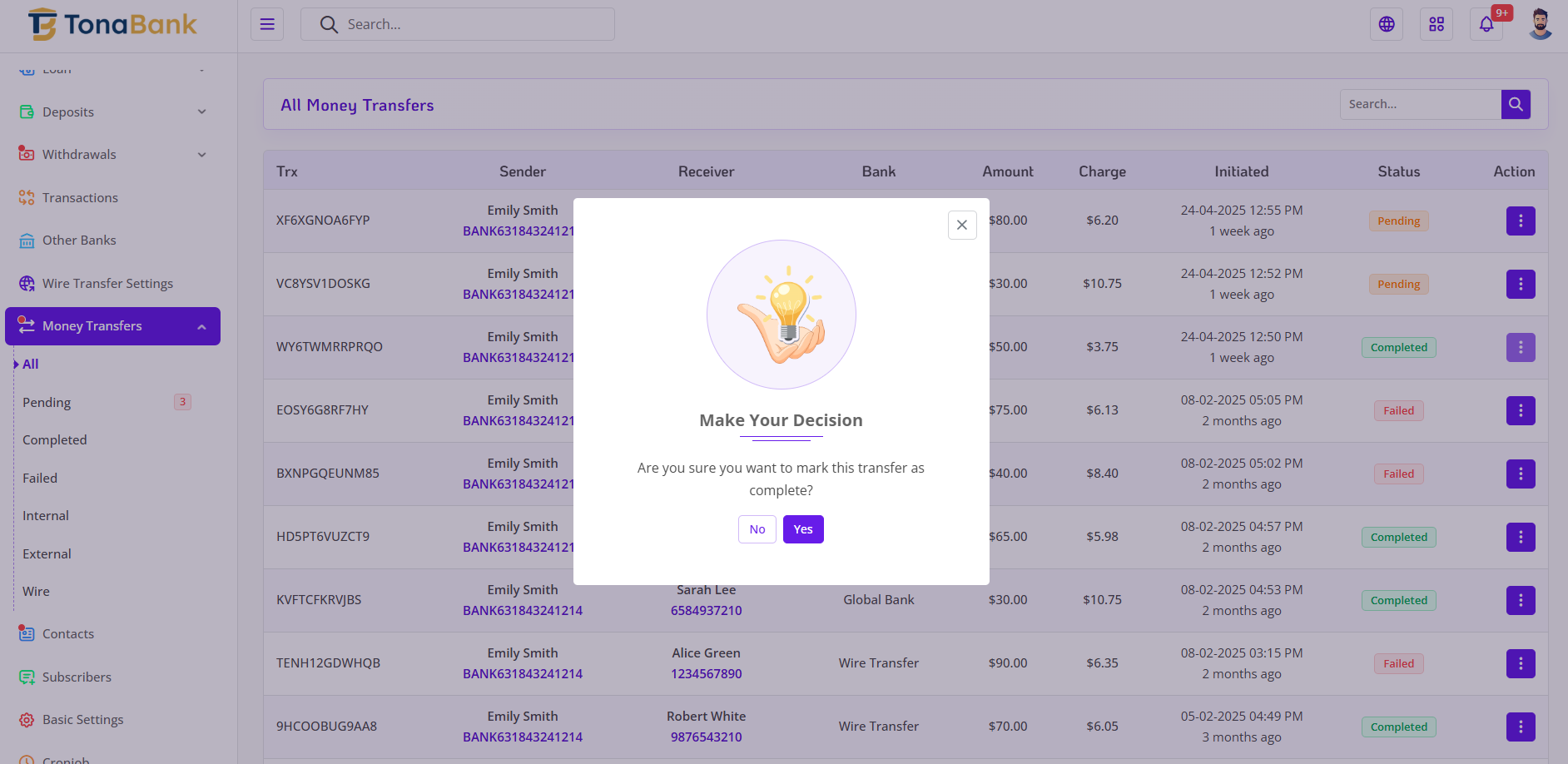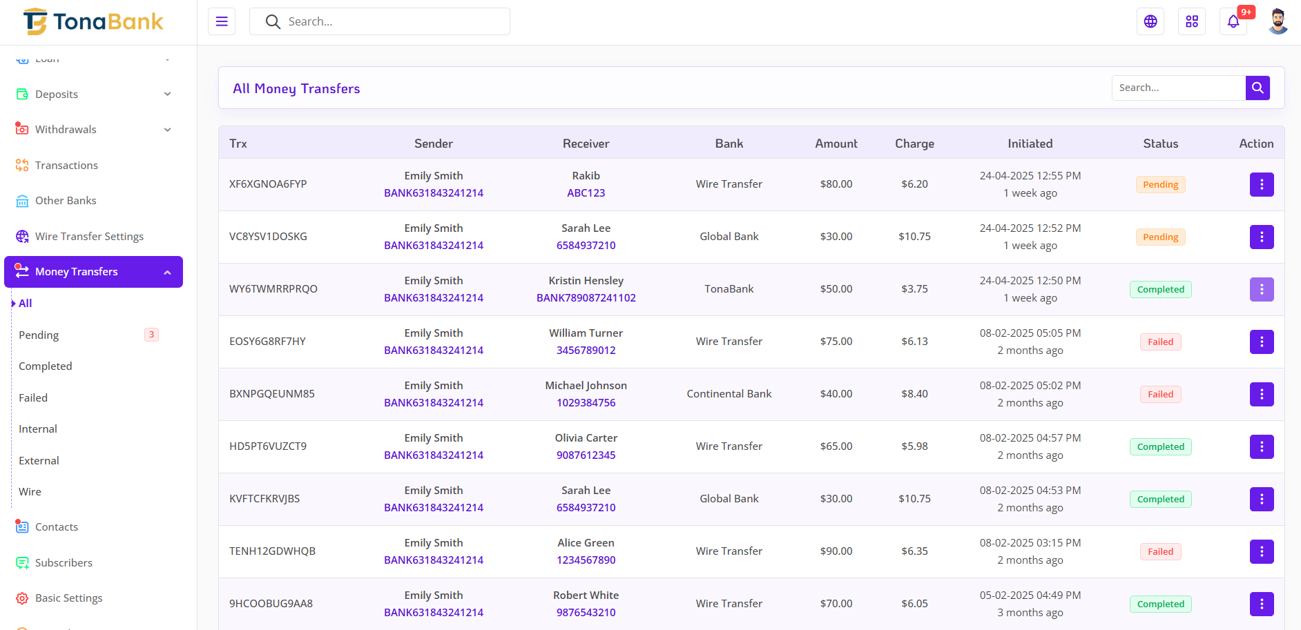The Money Transfer Setting module in TonaBank allows the admin to efficiently monitor and manage all money transfer activities across the platform. This section provides full visibility into the entire transfer process, enabling the admin to review transaction details, track transfer statuses, and intervene when necessary. With a centralized log and powerful status control, the admin can ensure accurate and timely handling of both internal and external transfers.
