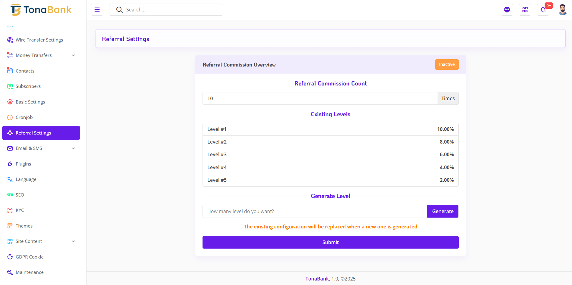 The TonaBank platform includes a versatile referral system designed to reward users for bringing in new members. This system supports Deposit based referral commission. It can be independently activated or deactivated by the administrator and is configurable for a multilevel referral structure, allowing for tiered commission distribution. These settings provide flexibility and encourage user engagement, helping to grow the platform's user base and increase overall activity.