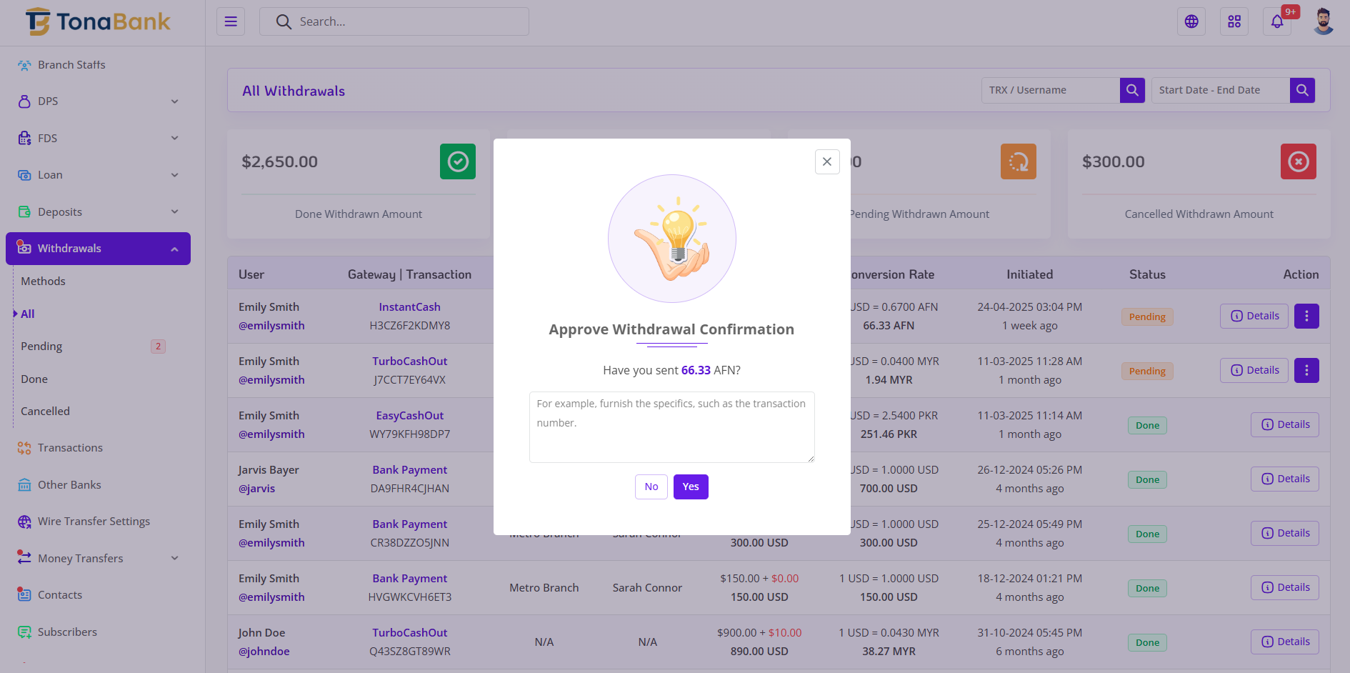 Facilitate a streamlined communication process by allowing administrators to ask transaction proof from users, ensuring a secure and accountable withdrawal process. -
