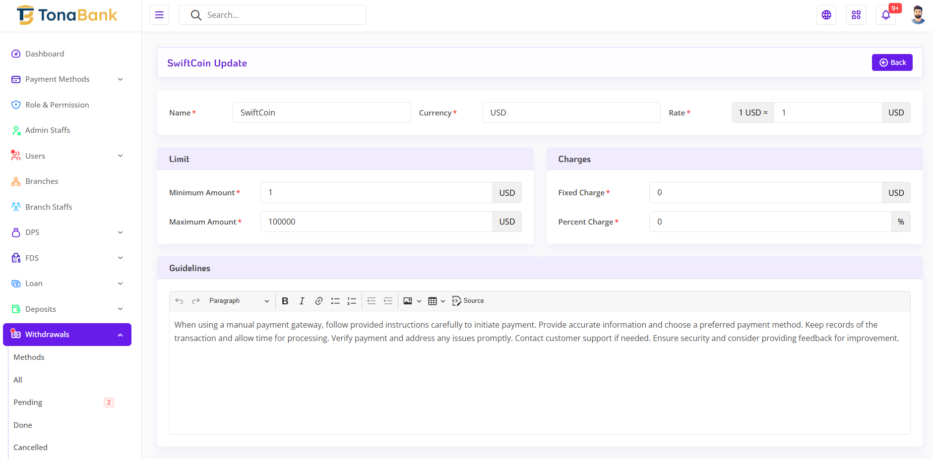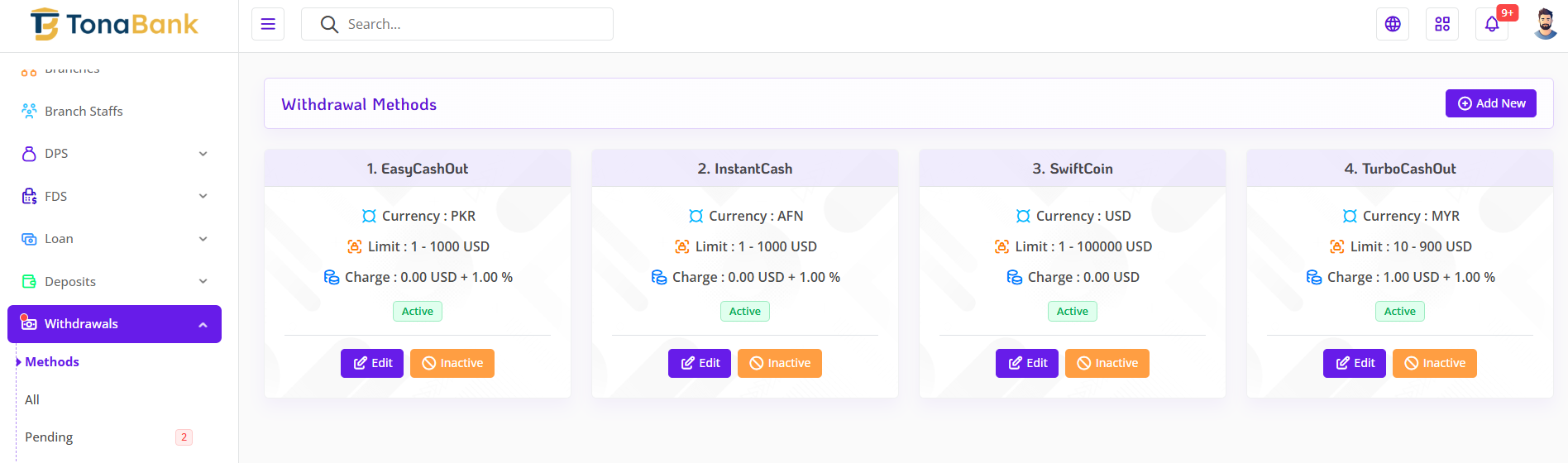 Discover the Withdrawals Method Management Section. Offering administrators detailed control over the manual withdrawal process. This feature-rich page is designed to streamline the management of withdrawal methods, providing clarity and flexibility for administrators.