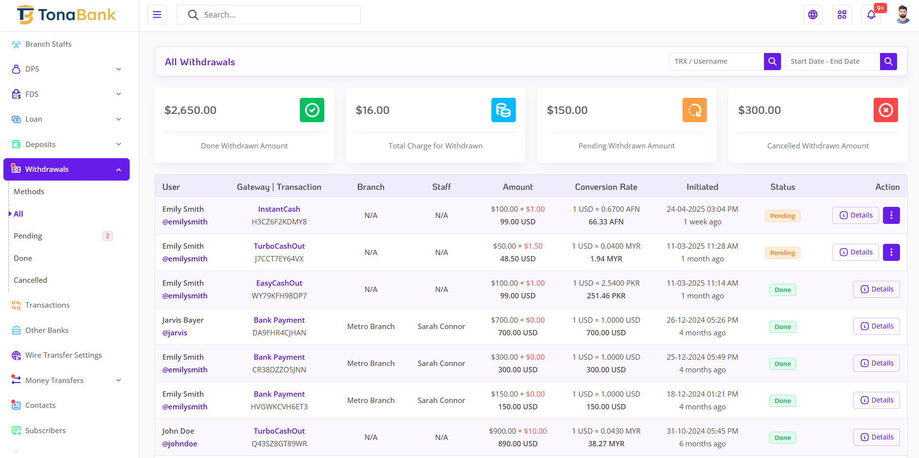 Explore the Withdrawals Management page within our Admin Panel, offering a comprehensive overview of financial transactions. This feature-rich page is designed to provide administrators with detailed insights into the status and details of user withdrawals.
