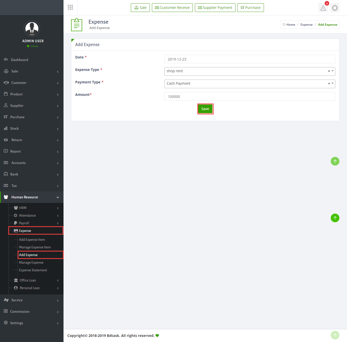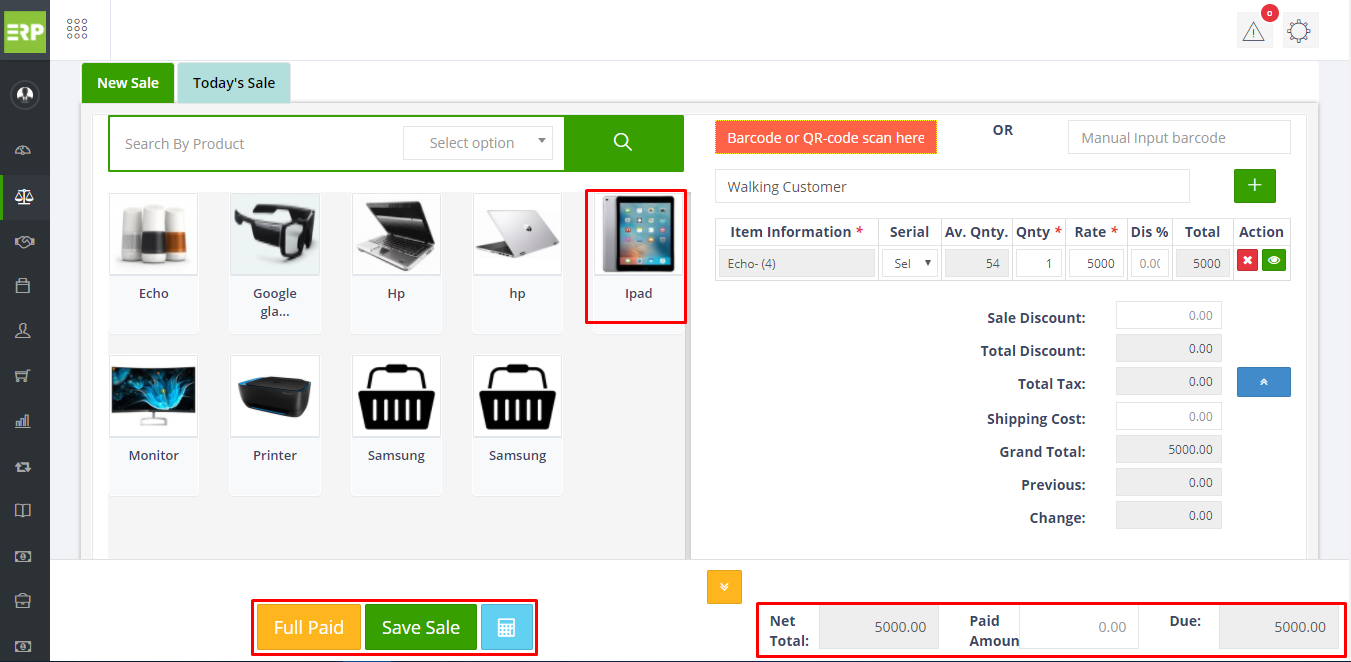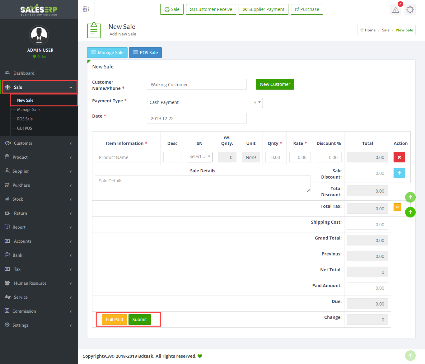 - Now , the Sale. To create a New Sale just go to Sale > New Sale and write the name of customer > item information > quantity > Rate > Save and paid. You can add multiple item at one invoice. Full Paid Button will make paid all the "Due" of the customer. You can't sale more than available stock quantity