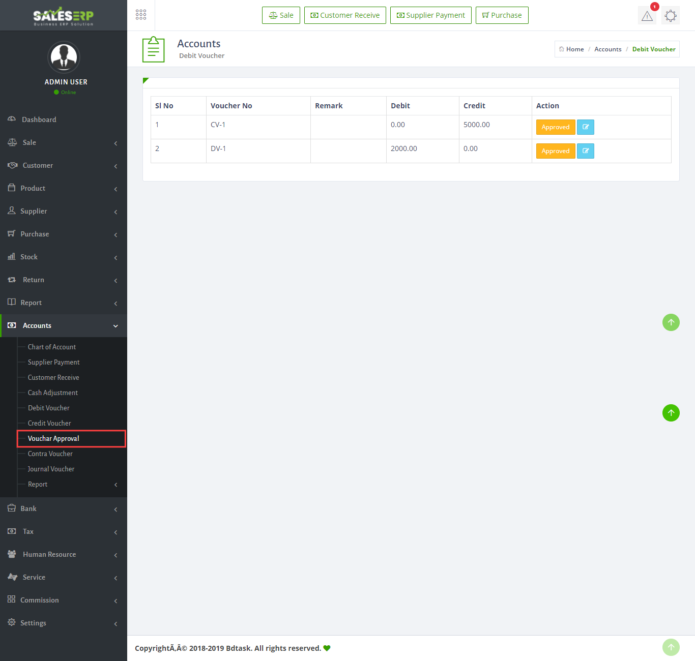 - To approve a debit or credit voucher just go to Accounts > Voucher Approval