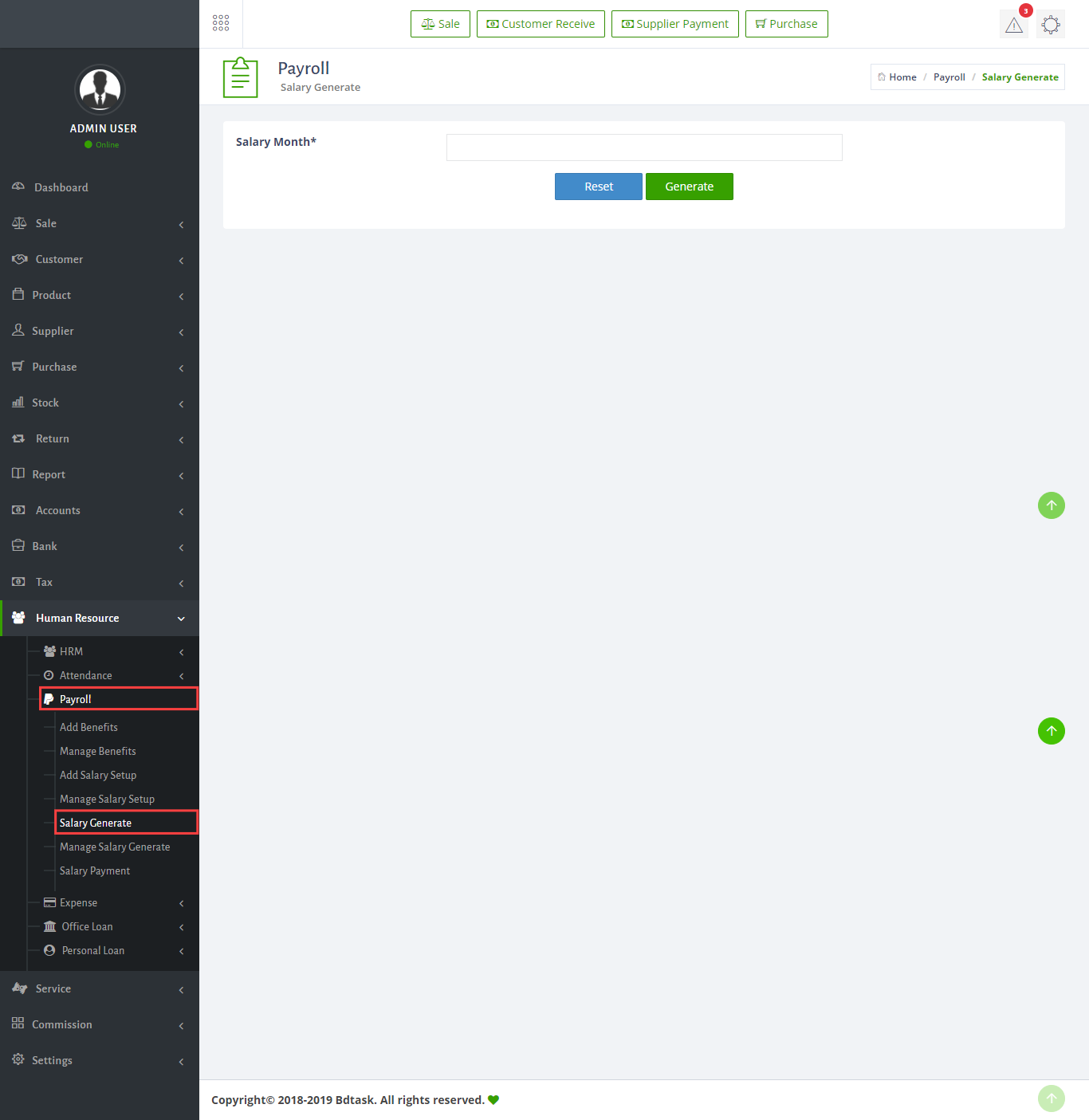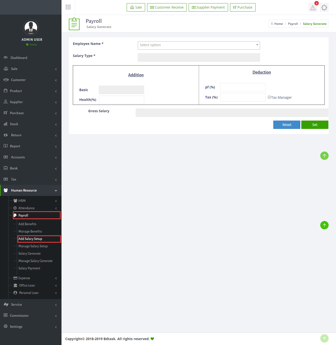 - There is payroll option in the Sales ERP. You can set salary for a employee, to find in go to Human Resources > Payroll > Add Salary Setup