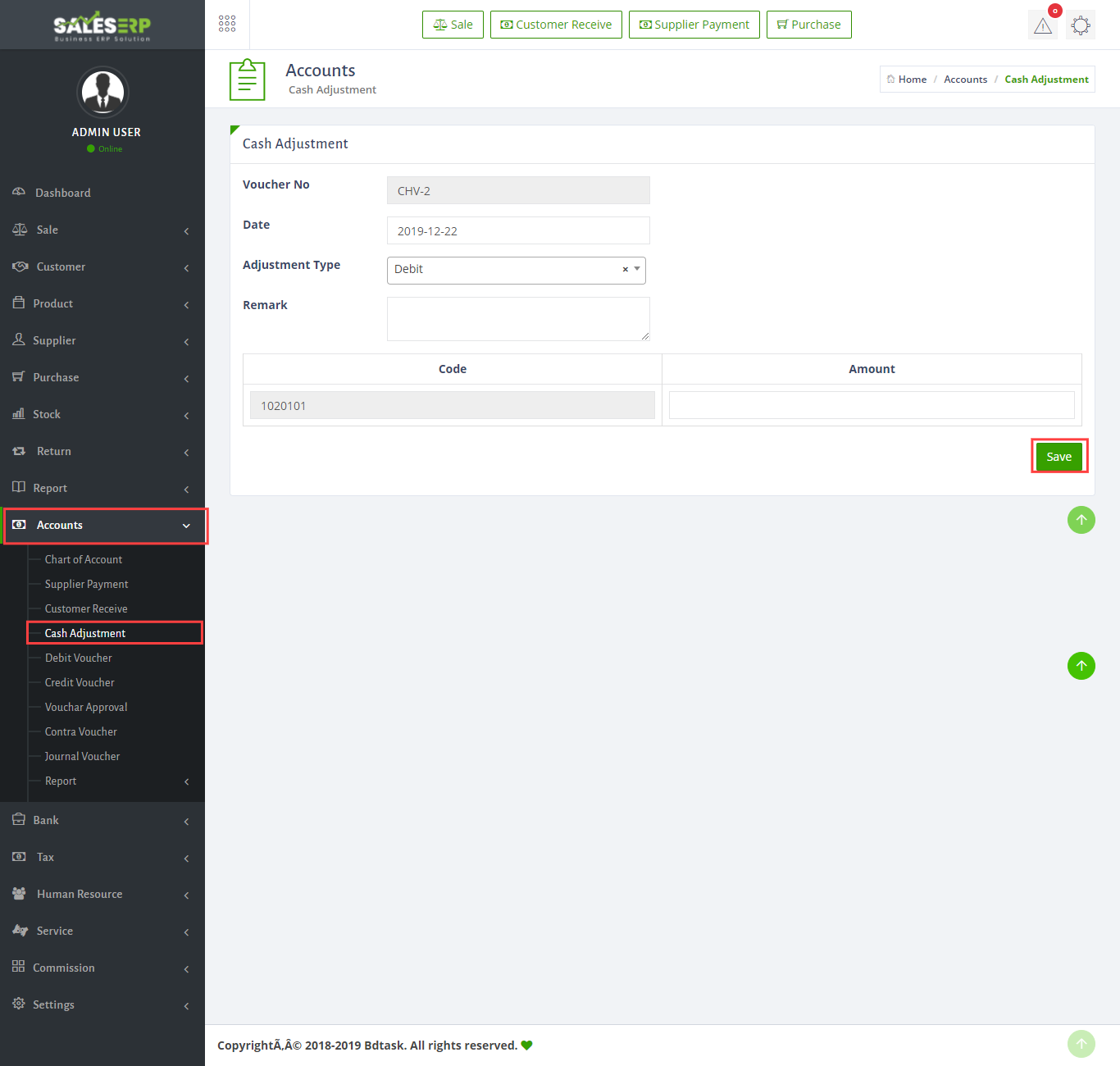 - To Adjust the cash just go to Accounts > Cash Adjustment and fill up information then click save button.