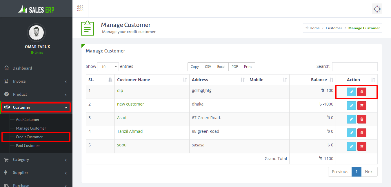 - To manage credit customer just go to Customer > Credit Customer.there have nice option to edit or delete any customer.