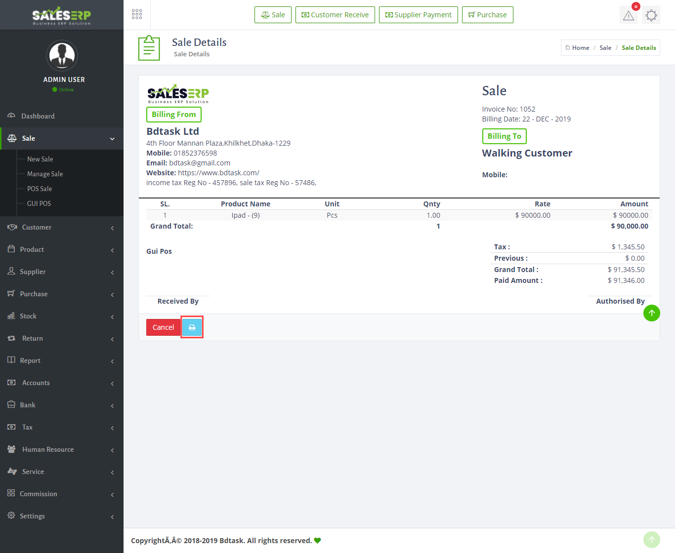 - After Creating Invoice you can see the invoice and can print it also.