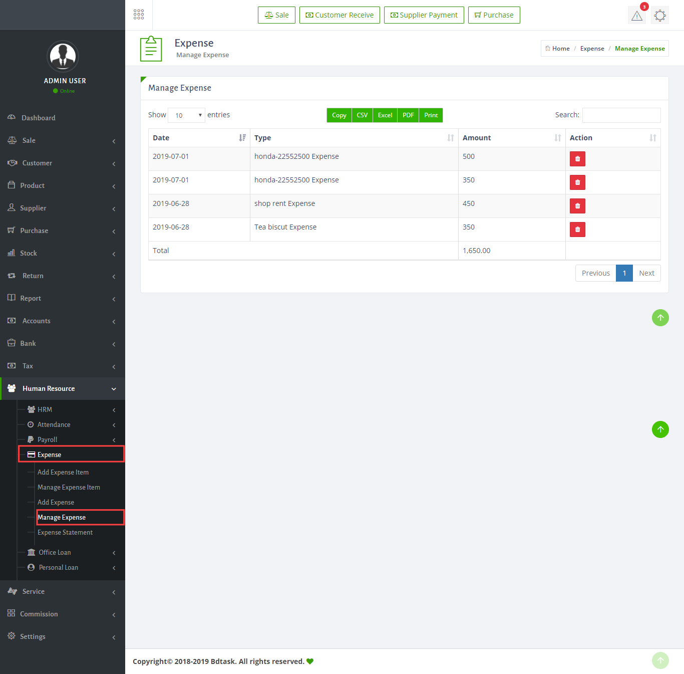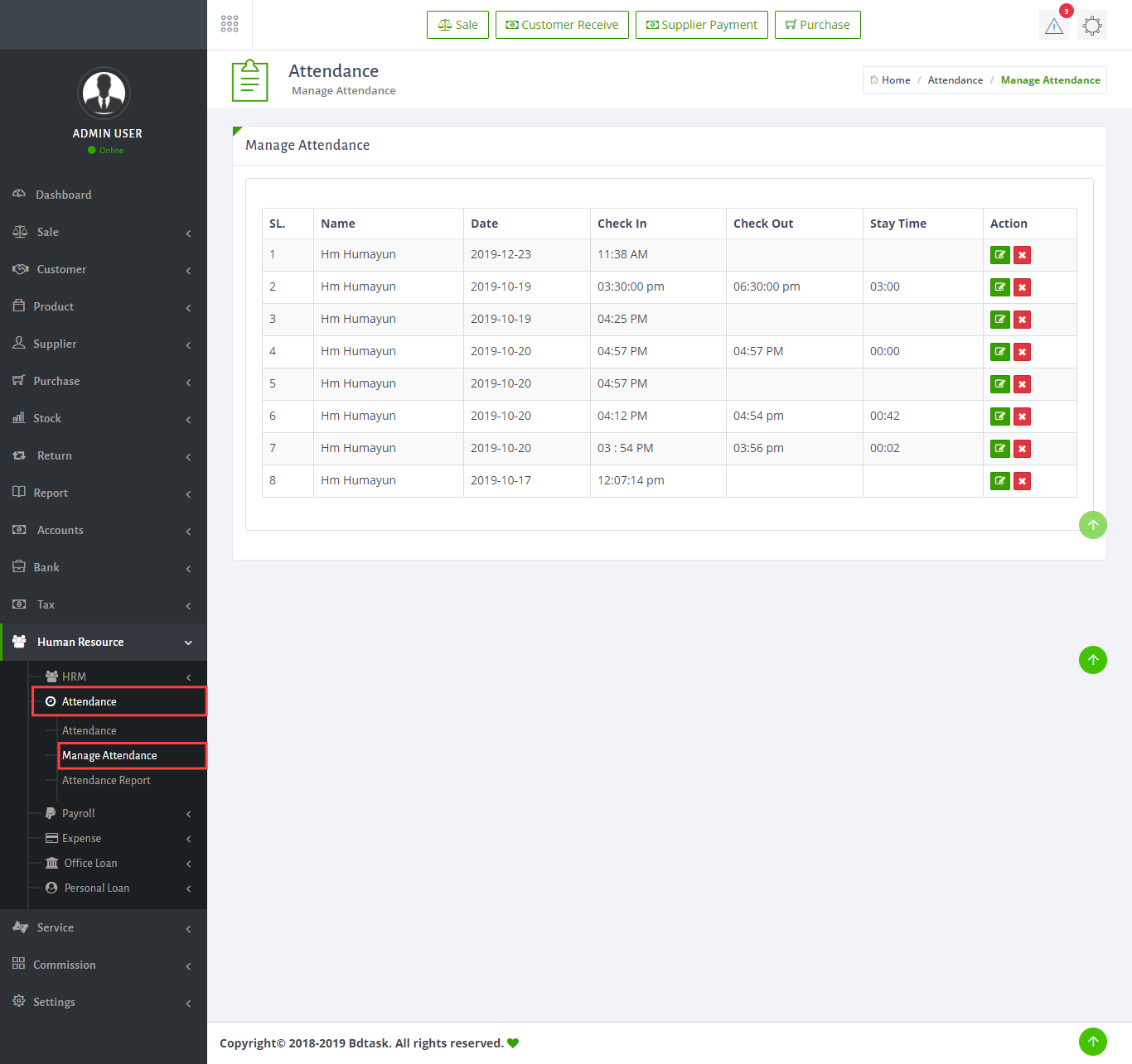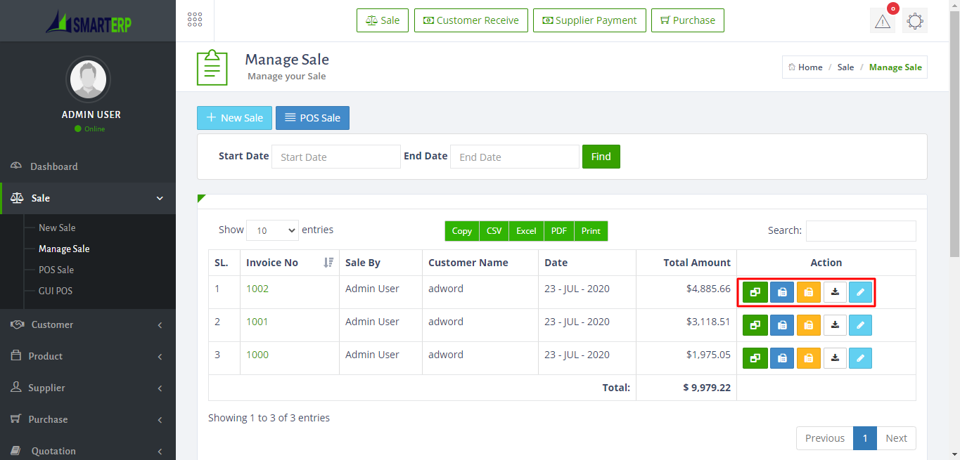 - To manage sale just go to Sale > Manage Sale.There is 5 different button in the invoice. first 3 button show 3 different kind of invoice. The white button download the invocie and for edit click on the blue button.