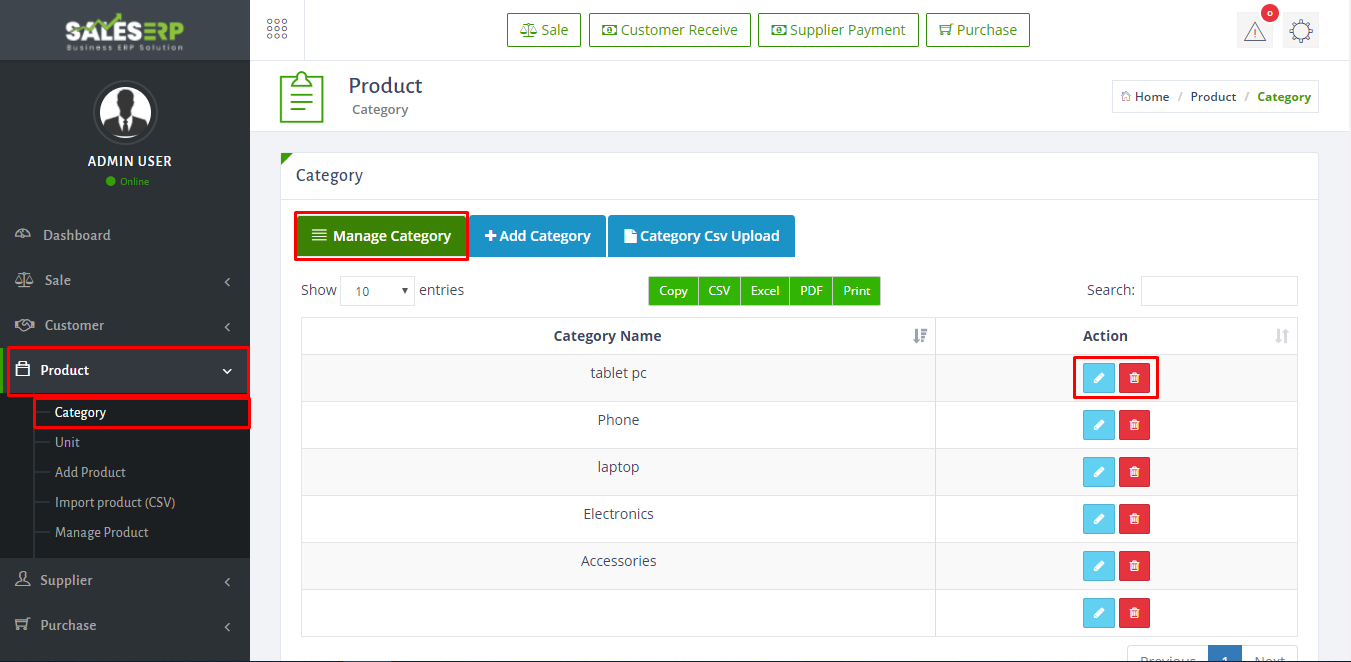 - To manage category or edit category just go to Product > Category > Manage Category. You can edit the category name by blue button and the red button for delete.