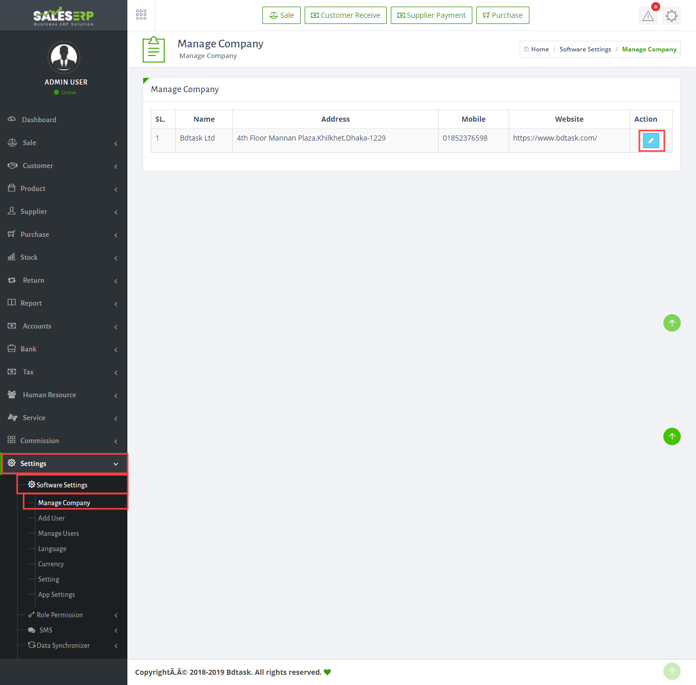 - To change your company name ,address and others details just go to Settings > Software Setting > Manage Company then look at the picture and click action option.
