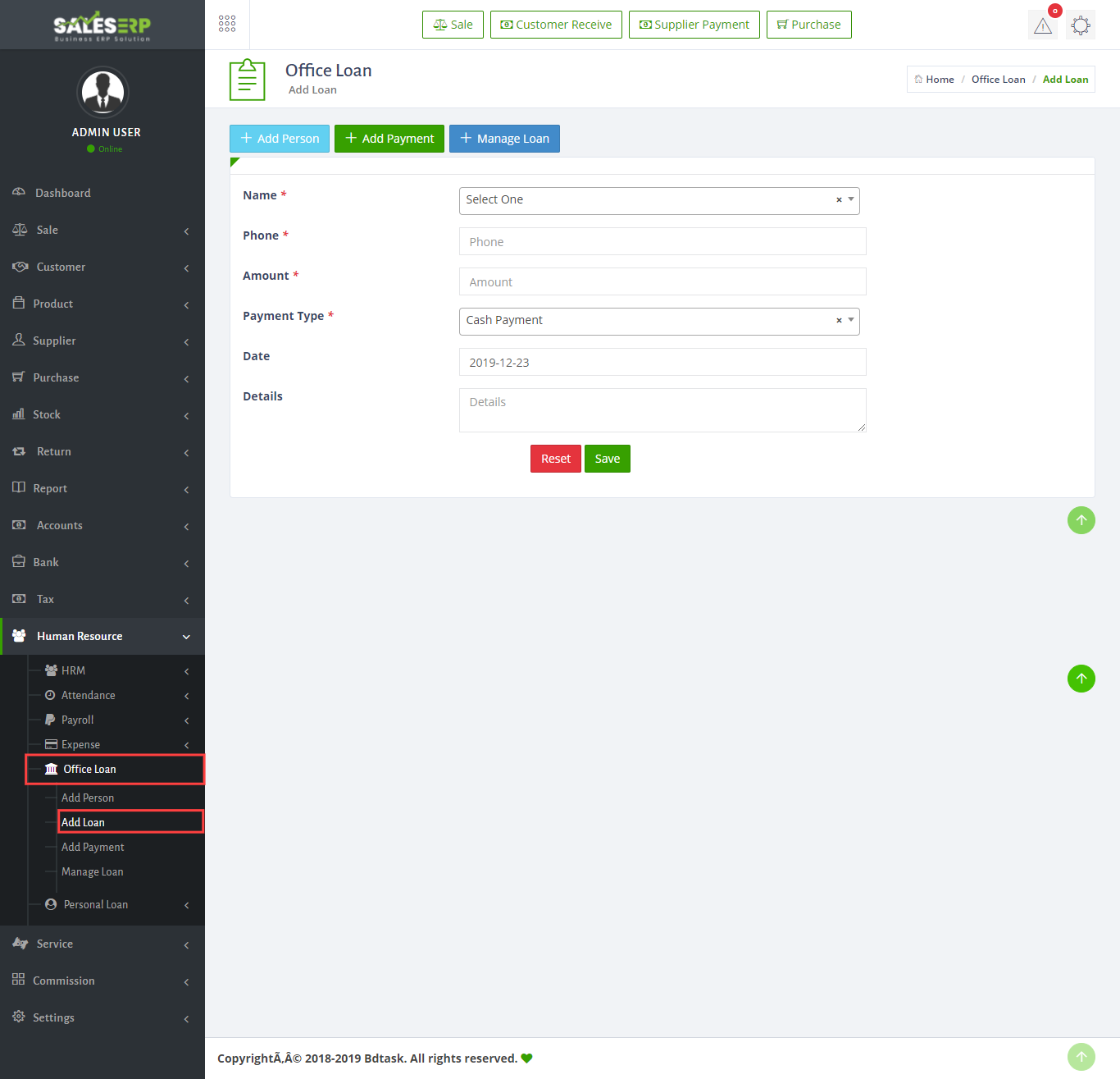 - There is a office lone option in the sales ERP. you can find it to go Human Resources > office lone
