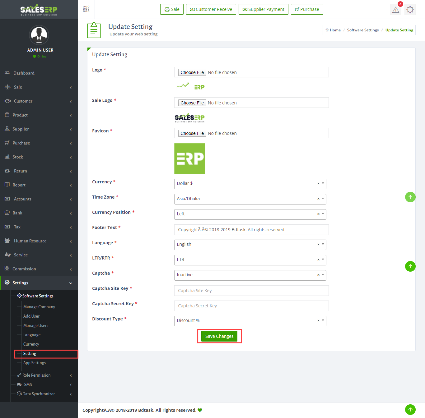 - To change others setting like logo,favicon,footer text,language and currency just follow picture.there have an exclusive feature to change LTR and RTL feature. just follow picture which type you want LTR or RTL you can change.