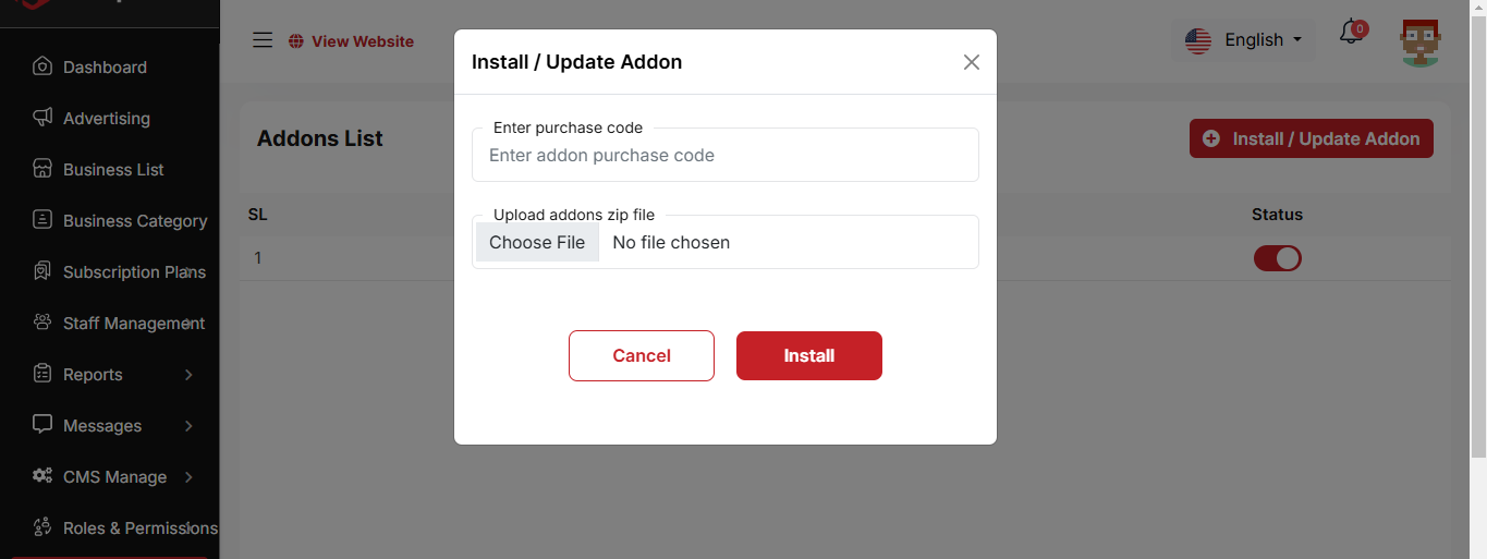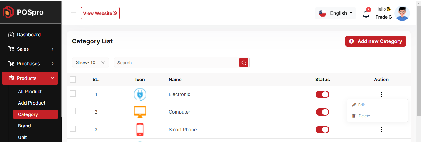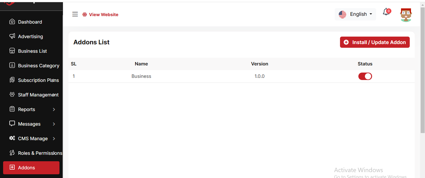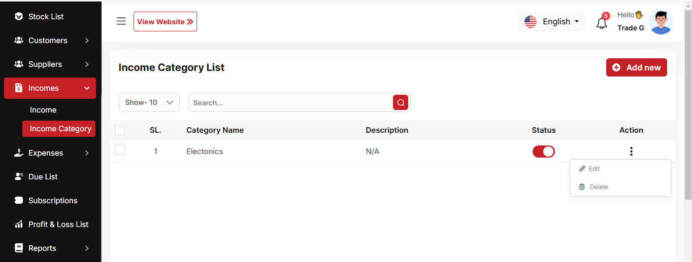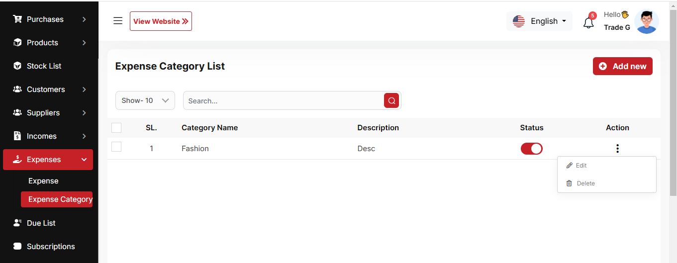 This appears to be a screenshot of a business categories list. Here, you can filter business categories, as well as edit, delete, or multi-delete them. There is also an "Add New" button for adding new business categories. To add a new business category, fill in the necessary fields. You need to enter the business name, and the description field is optional. You can also update the status from this page.