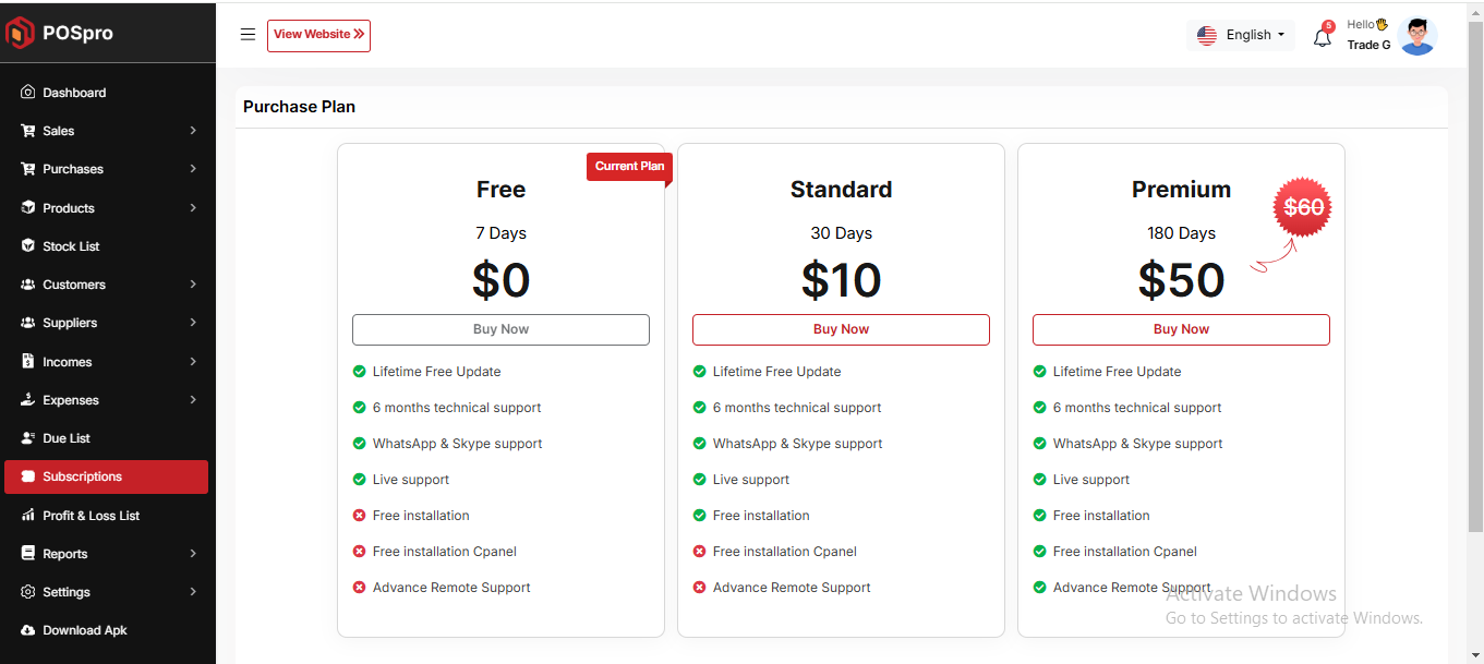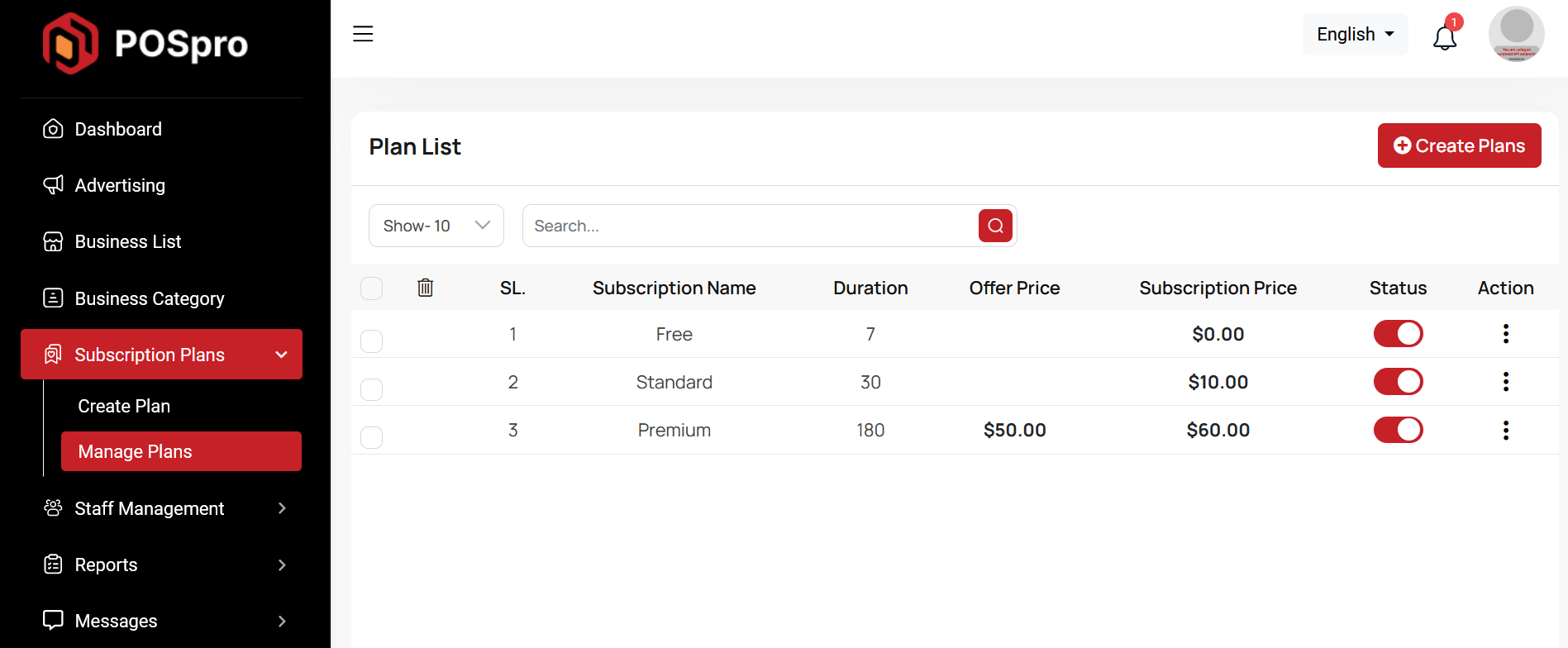Here, you can view a list of available plans with filtering options. You can also change the plan status from this page. Additionally, options to view, edit, delete, and multi-delete plans are available.