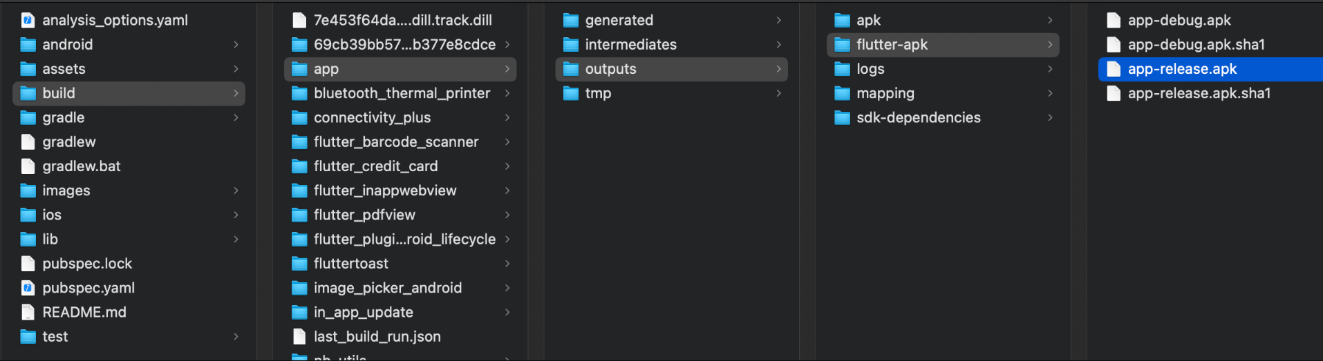 After completing the build process, go to the build directory of the main project directory. It will build a new release apk file named "app-release.apk". path: build > app > outputs > flutter-apk
