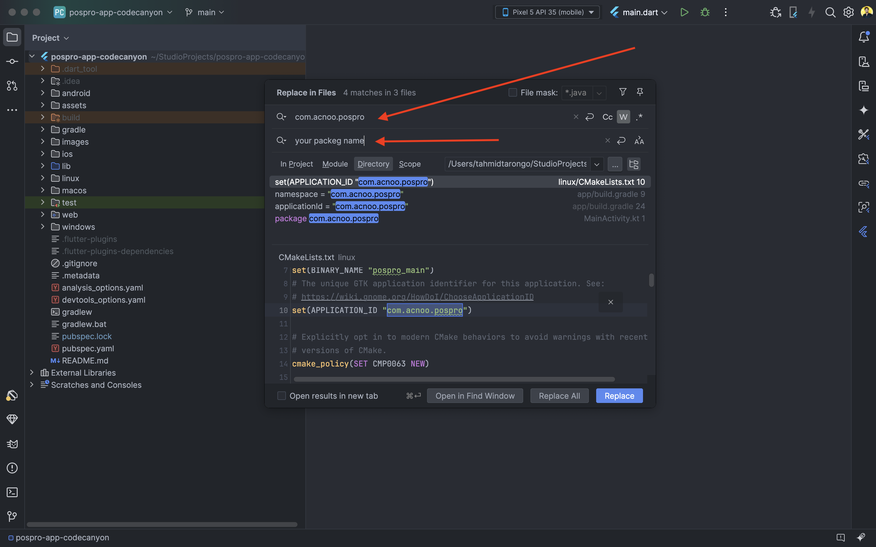 Step 1: Find and Replace the Package Name in Android Studio. Open your Flutter project in Android Studio. Use the Find and Replace feature: Press Ctrl + Shift + R (Windows/Linux) or Cmd + Shift + R (Mac) to open the "Find in Path" dialog. In the "Find" field, enter the old package name: "com.acnoo.pospro". In the "Replace" field, enter the new package name: "your package name". Make sure the scope is set to "Project" to include all files. Click "Replace All" to update all instances of the old package name in the project.