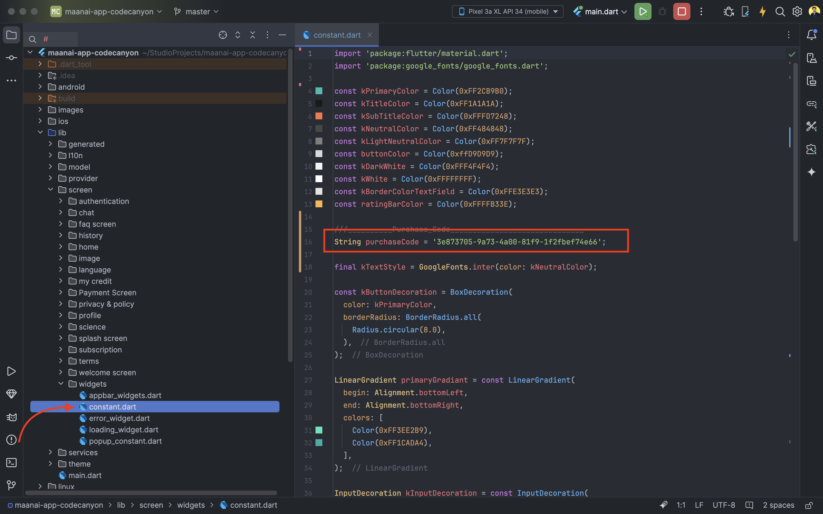 Important: Only update the value of purchaseCode. Changing anything else may cause issues.