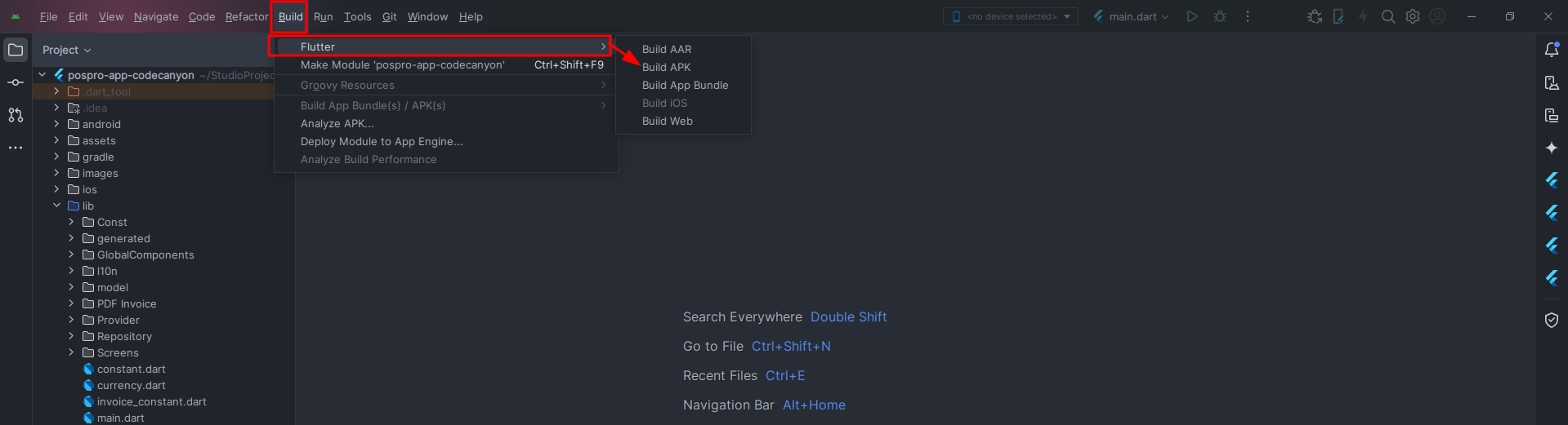 To build an APK, go to the menu section of your environment, then select the Build section and move the cursor on Flutter and then select the Build APK. That's all. After some time it will build a release APK file. For windows click on the main menu option (Four line) from top left, you will see the same toolbar list.