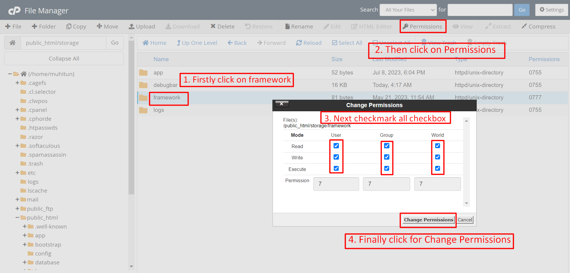 Note : If your control panel has no terminal window, then go to public_html or the directory where you have uploaded the project. now give permission for some system folders that show on Installer. For example, we have demonstrated storage/framework directory permission in the below image.