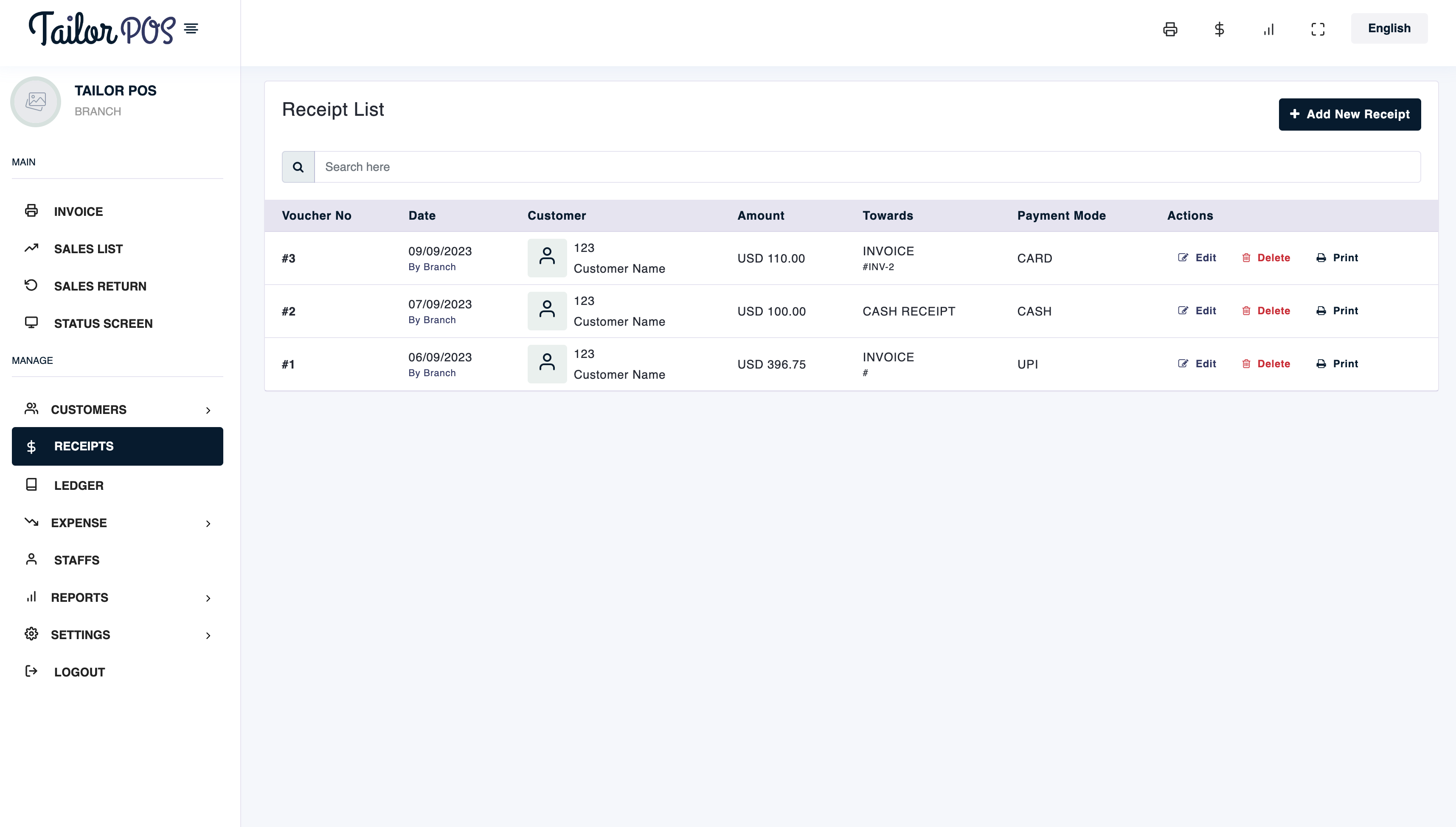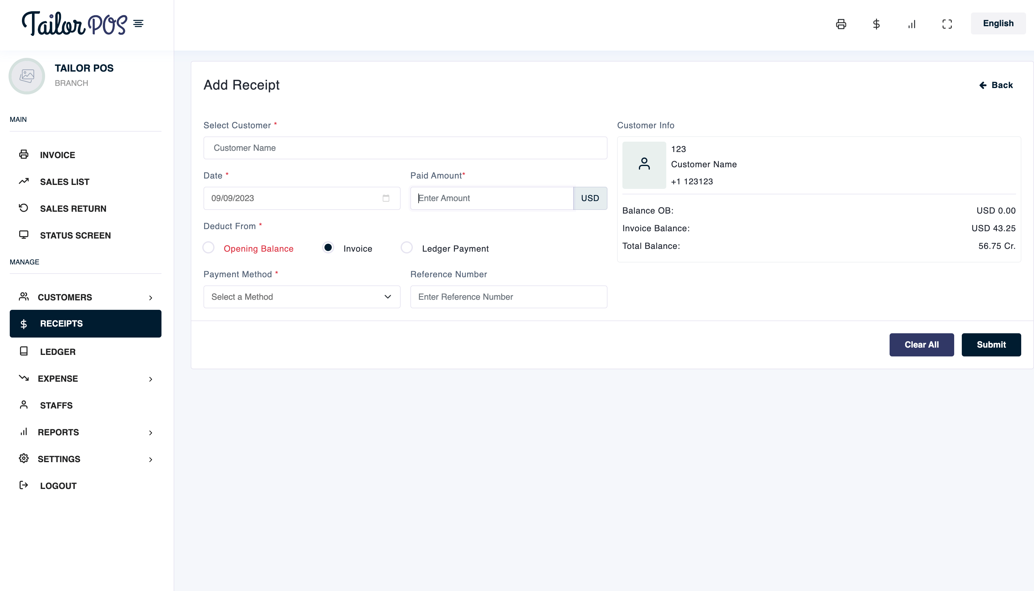 - Ledger Payment - A Payment will be added towards the customer which will be shown in receipts and ledger, but unpaid invoices will not be closed.