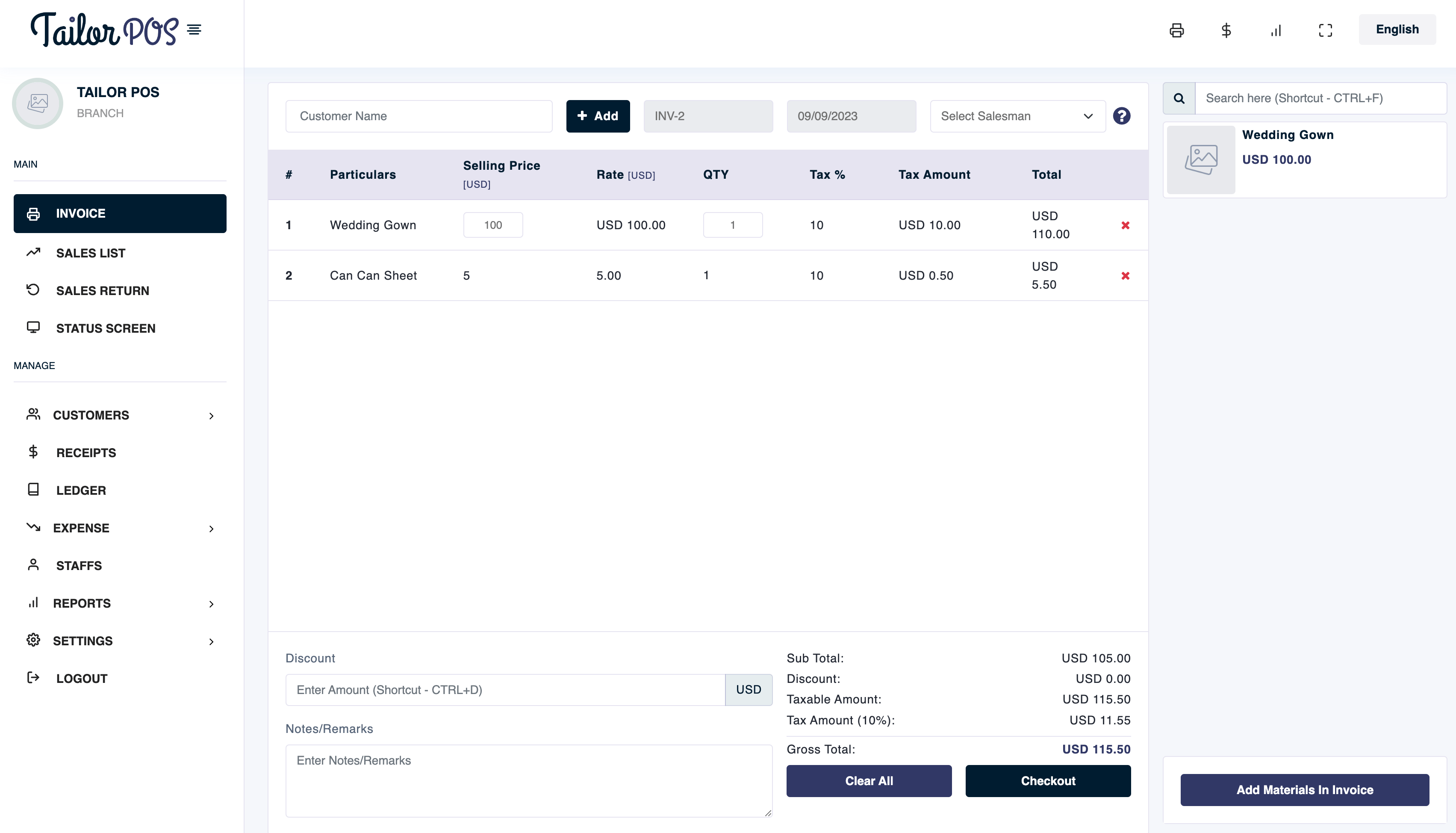 - Add Materials by clicking on the Add Materials In Invoice button.