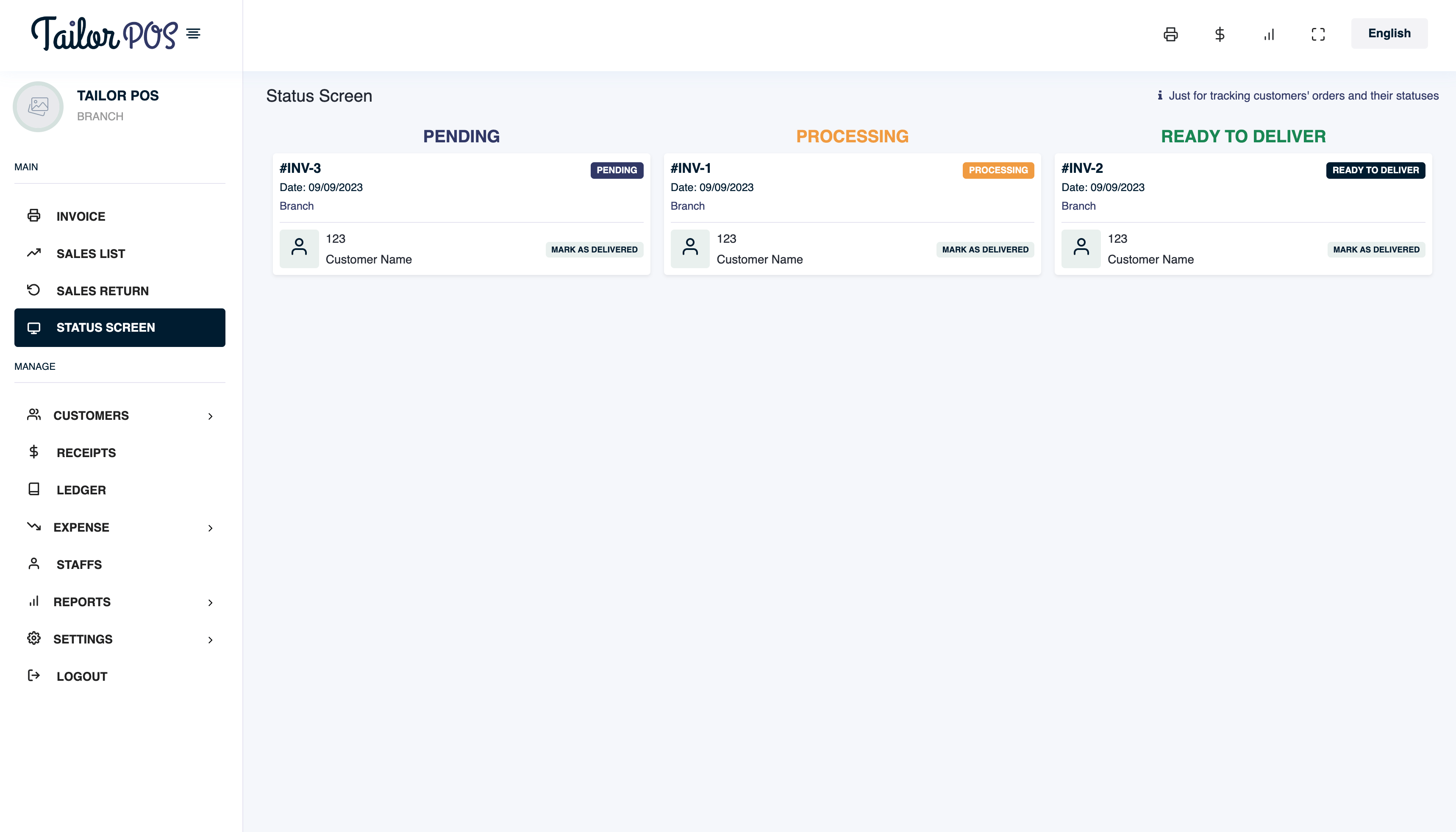 - Use mark as delivered to hide the order from the status screen and mark the order as complete.