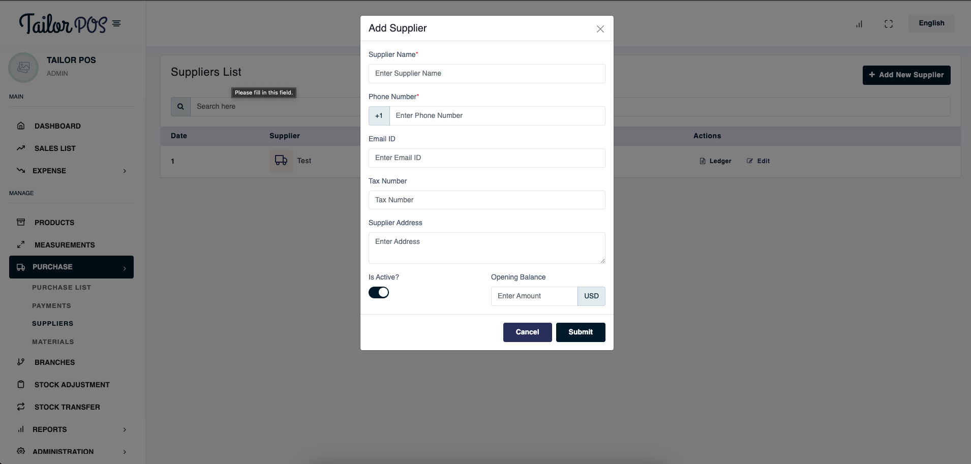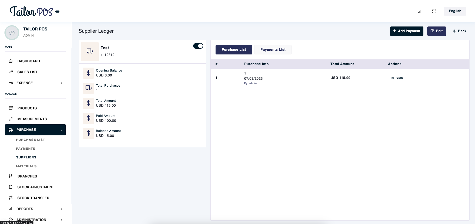 - You can view the supplier's ledger by pressing the View Ledger button in the suppliers view page.